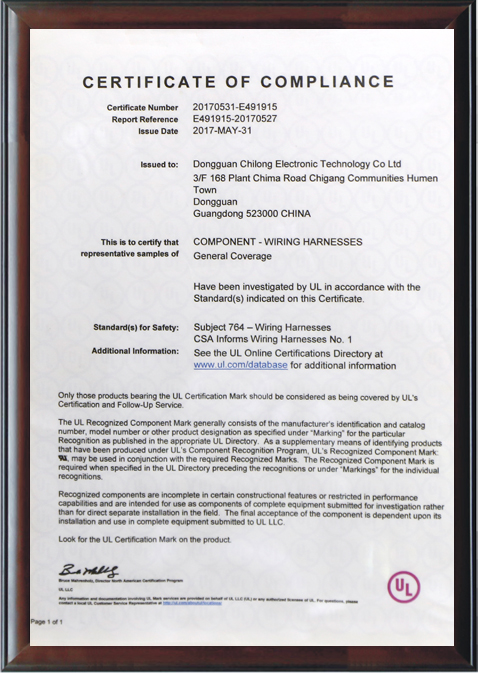 公司通過并擁有電線之UL安規(guī)認(rèn)證,電線加工之UL認(rèn)證,質(zhì)量管理體系之ISO9001認(rèn)證。
